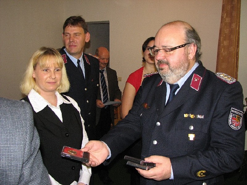 Das Hochwasser an der Schwarzen Elster wurde zum Anlass einer am Freitagabend außergewöhnlichen Dankeschön-Veranstaltung. Der Kreisfeuerwehrverband und der Landkreis hatten in die Gaststätte "Zur Quelle" in Baasdorf eingeladen. Jedem wurde dabei eine spezielle Ehrennadel überreicht.