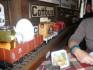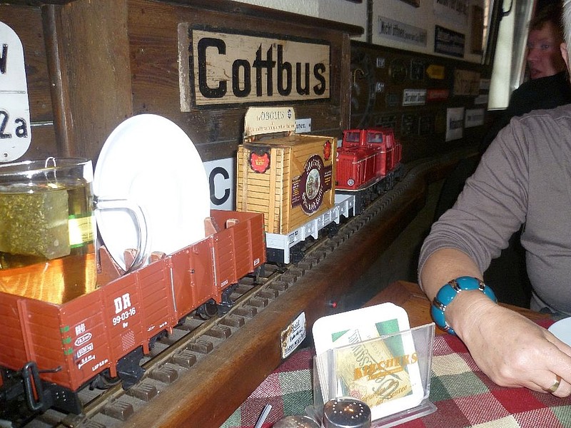 Unser nächster Weg führte uns zum Mittagessen in den Spreewaldbahnhof Burg. Ein wunderbarer, alter Bahnhof, umgebaut zur Gaststätte, in dem eine kleine Eisenbahn die Getränke an die Tische brachte. Das Mittagessen mundete allen vorzüglich und so konnte es dann zur Kahnfahrt gehen.