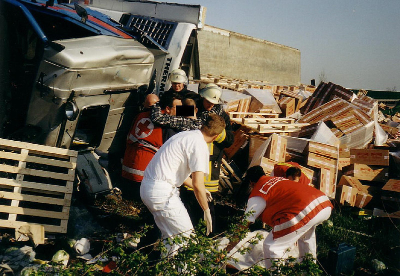 Der Fahrer war im Führerhaus eingeklemmt, wurde von den Kameraden der FF Zörbig befreit und anschließend schwer verletzt dem Rettungsdienst übergeben.