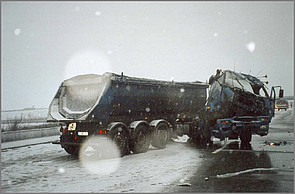 Auf einer leicht zugeschneiten Autobahn kam es zur Kollision zwischen einem Reisebus und einem LKW.