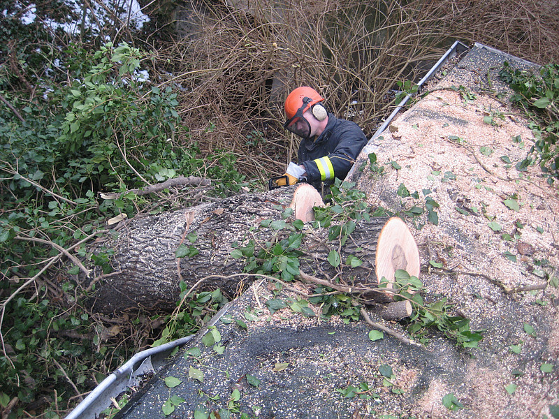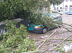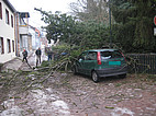 Ein umgestürzter Baum lag auf einer Laube und zum Teil auf einem Auto.