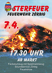 Am Samstag, dem 07. April findet ab 17:30 Uhr das alljährliche Osterfeuer auf dem Gelände der Ortsfeuerwehr Zörbig statt.