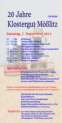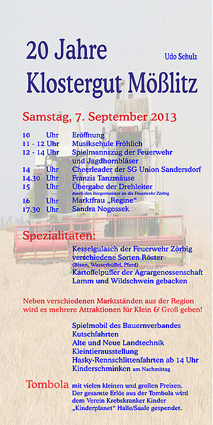 Am Samstag, dem 7. September, feiert das Klostergut Mößlitz sein 20-jähriges Bestehen. Hierbei findet um 15 Uhr die Übergabe der neuen Drehleiter an die Kameradinnen und Kameraden der Ortsfeuerwehr Zörbig statt. Im Anschluss erfolgt durch die Feuerwehr Zörbig eine Gegenüberstellung der alten und neuen Technik. Hierbei können sich alle Anwesenden ein Bild von der Entwicklung der Technik machen.