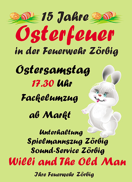 Am Samstag, dem 30. März findet ab 17:30 Uhr das alljährliche Osterfeuer auf dem Gelände der Ortsfeuerwehr Zörbig statt.